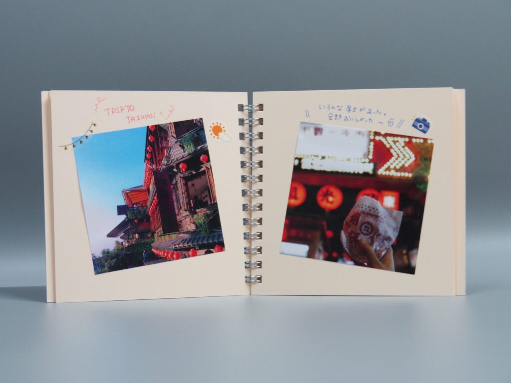 正方形(89mm角)が4枚、L判サイズの写真が2枚貼れる台紙サイズです。