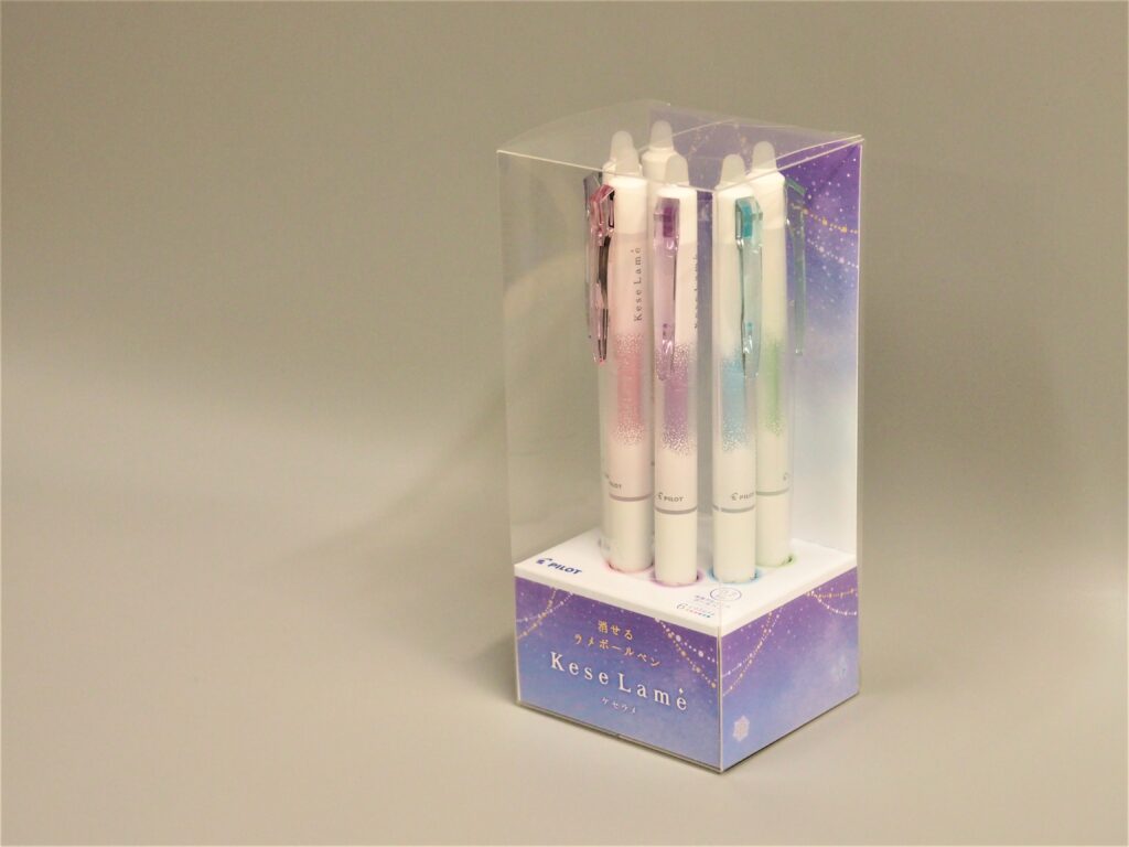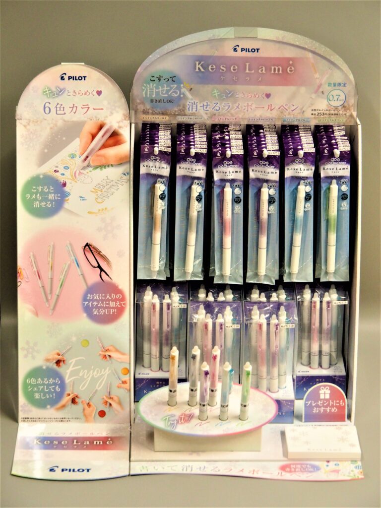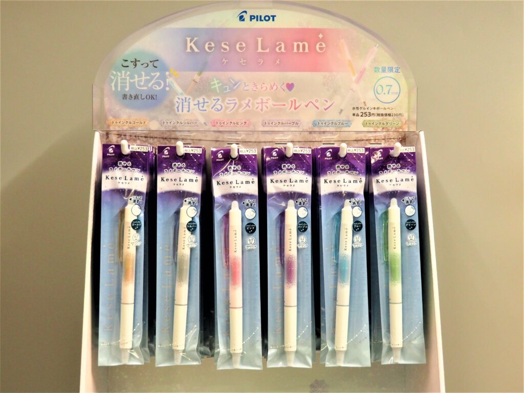 インキ色は、ゴールド、シルバー、ピンク、グリーン、ブルー、パープルの6色です。店頭にて試筆も出来ますので、「消せるラメペン」を是非お試し下さいませ。