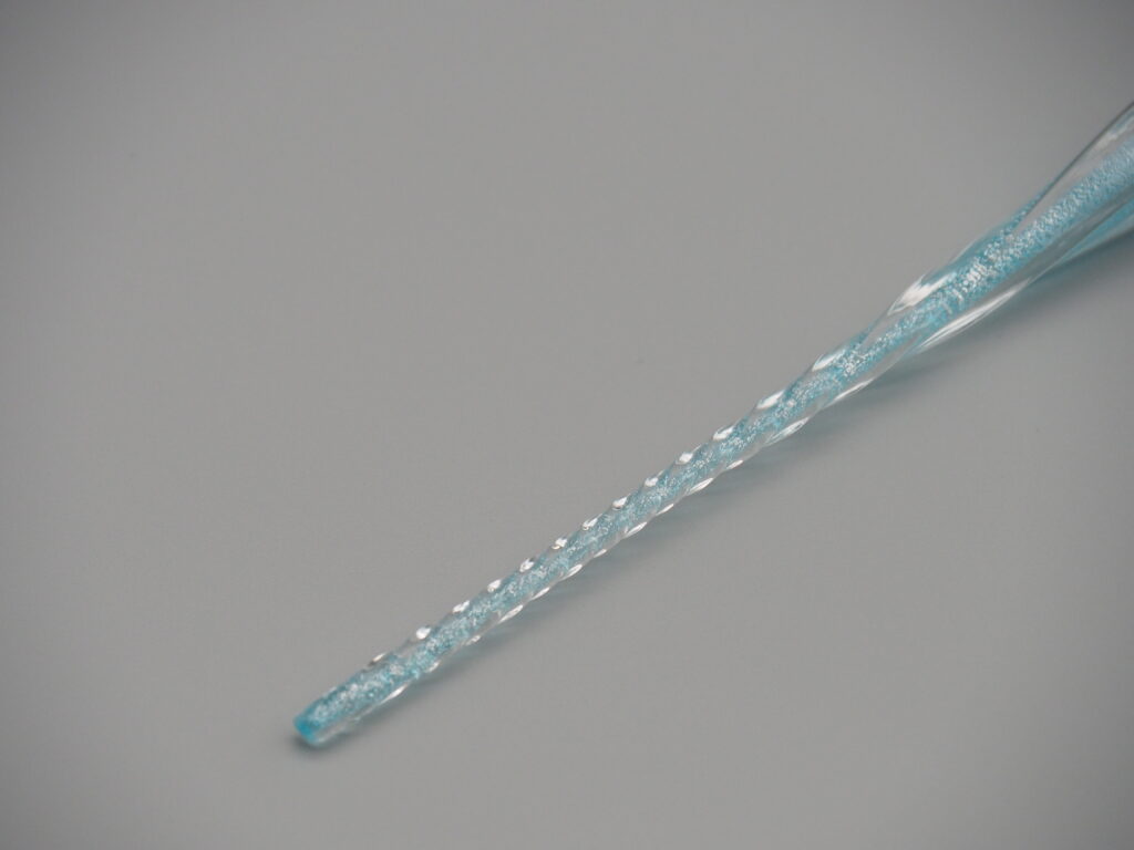 この度入荷したガラスペンの特徴はペン先に螺旋(らせん)状の溝があり、そこにインクが溜まる事で通常のつけペンより筆記距離が長くなります。